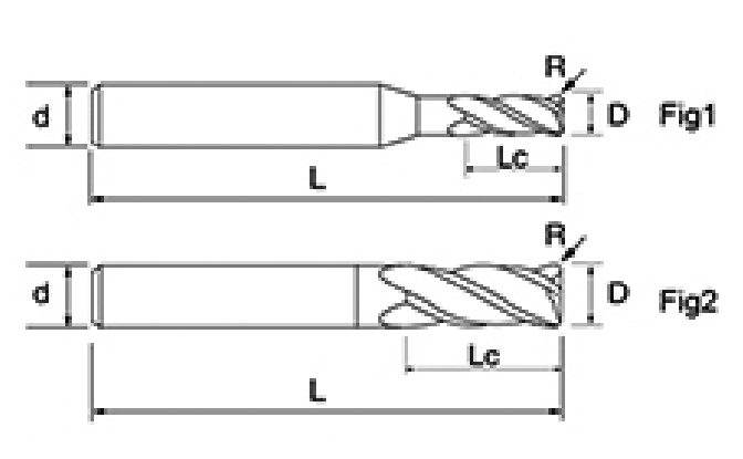 | Nei. | Diameter D | R Vinkel R | Fløytelengde Lc | Totallengde L | Shank Dia d | Bladtall F |