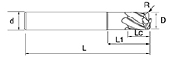 | Nei. | Diameter D | R Vinkel R | Fløytelengde Lc | Effektiv lengde L1 | Totallengde L | Shank Dia d | Bladtall F |
