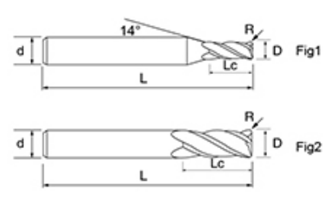 | Nei. | Diameter D | R Vinkel R | Fløytelengde Lc | Totallengde L | Shank Dia d | Bladtall F |